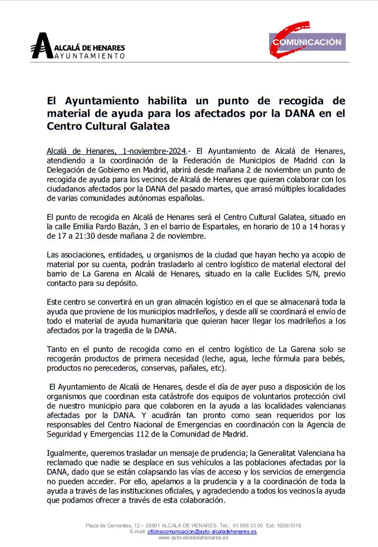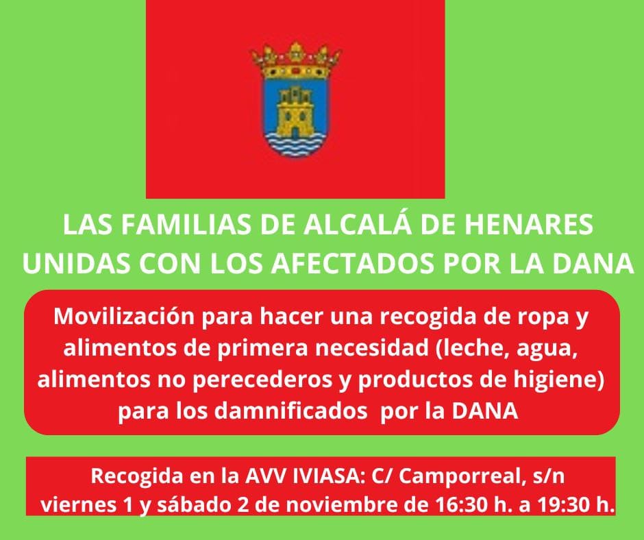 ➡️ El Ayuntamiento de Alcalá de Henares ha habilitado un punto de recogida en el Centro Cultural Galatea, calle Emilia Pardo Bazán, 3 en el barrio de Espartales, desde mañana 2 de noviembre. El horario será: