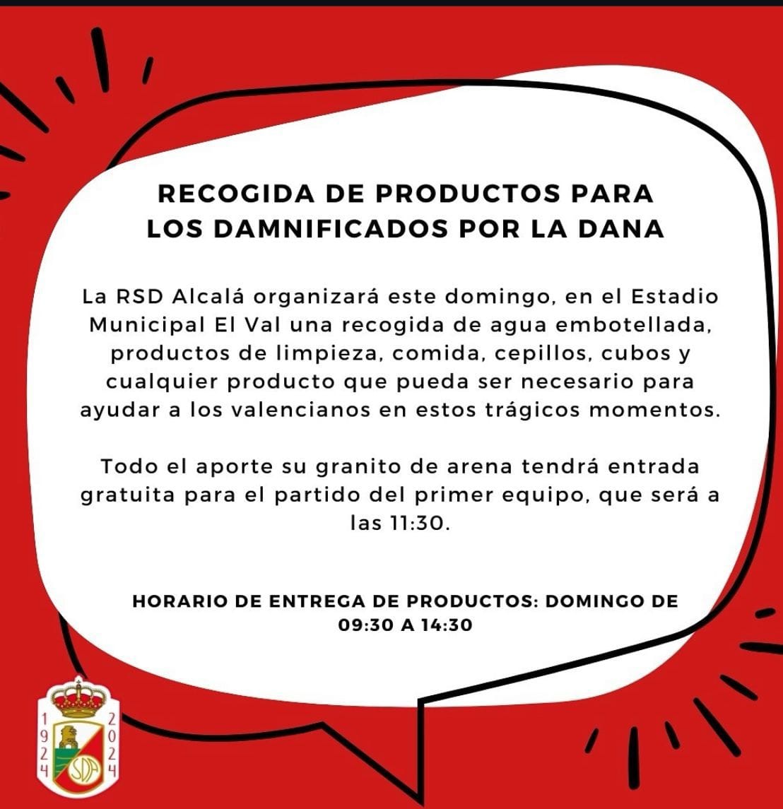 ➡️ La RSD Alcalá organiza este domingo, en el Estadio Municipal de El Val, una recogida de agua, productos de limpieza, comida no perecedera, cepillos y cubos de limpieza y cualquier otro producto que pueda ser necesario para los damnificados. Todo el que aporte su granito de arena recibirá una entrada gratuita para el partido del primer equipo que será a las 11:30.